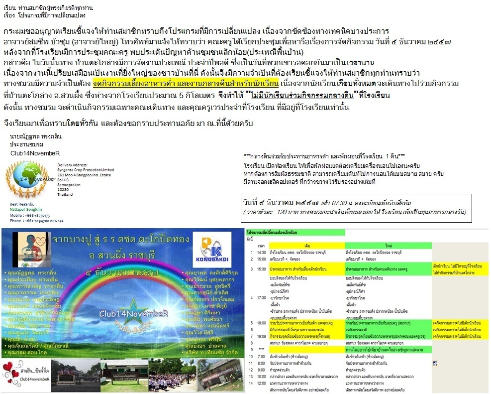 หมายเหตุ : มีทริปแนะนำช่วงกลางคืน หากสมาชิกสนใจ สามารถไปเที่ยวงานประจำปีที่ยิ่งใหญ่ ของชาวสวนผึ้ง ที่บ้านตะโกล่าง ห่างจากโรงเรียนประมาณ 5 กิโลเมตร เที่ยวเสร็จกลับขึ้นมานอนที่โรงเรียน