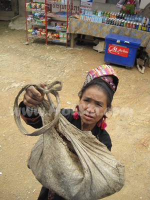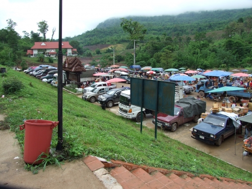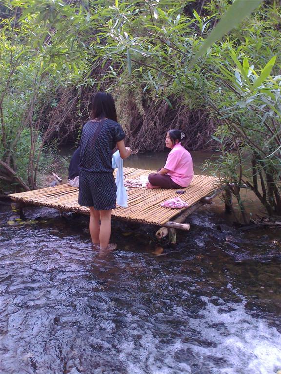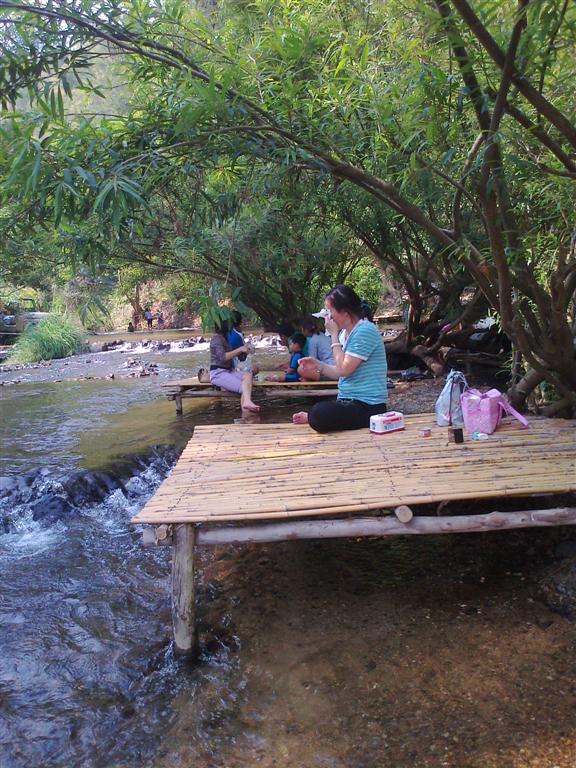 เดินทางมาเรื่อยๆ จนประมาณบ่ายกว่าๆ คนขับก็จะจอดพักรถดับเครื่องประมาณ 30 นาที แวะกินข้าว กินน้ำ ล้างหน้าล้างตา จุดที่พักจะมีน้ำตกป่าเล็กๆ ให้เราดื่มน้ำจากธรรมชาติ มาถึงตรงนี้แต่ละคนจะงัดอาหารที่เตรียมขึ้นมากินกันอย่างอร่อย จับกลุ่มเป็นกลุ่มๆ เอาอาหารมารวมกันคุยกันแบบกันเอง ผมเองไม่มีอะไรกินแบบเขามีแค่แอปเปิ้ลลูกเดียวก็หายหิวแล้ว ชาวบ้านก็เรียกผมกินข้าวผมก็ไปนั่งคุยกับเขา แต่ไม่ได้กินกับเขาเกรงใจครับกลัวเขาไม่อิ่ม อีกอย่างก็ไม่ค่อยคุ้นกับอาหารเขาเท่าไร อาหารที่เขากินส่วนใหญ่ก็หน่อไม้ที่ขายที่สถานีรถ เอามาจิ้มแจ่ว บางคนมีขอพิเศษหน่อยก็เป็นกระรอกปิ้งไฟแค่นั้นก็หรูแล้วครับ