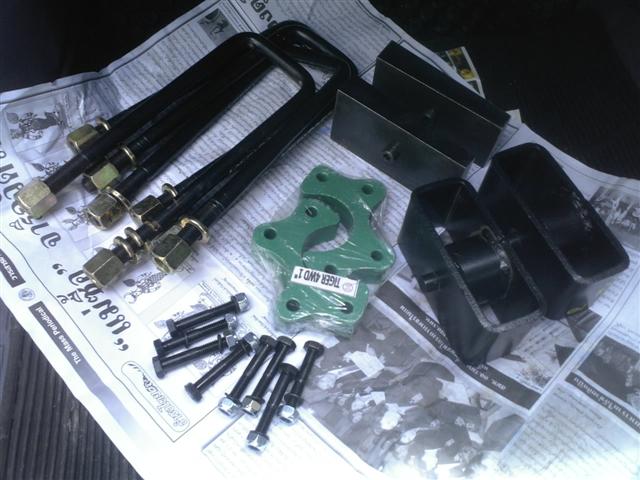 ยก2" ข้างหน้าใส่ก้อนรองลูกหมาก 0.5-1" (ตัวเขียวๆ ในรูป) ไขทอชั่นบาร์ช่วยอีกหน่อย แล้วลองวิ่งดูก่อน โช้คเดิมยังพอเอาอยู่ แต่ถ้าเป็นคนขับรถเร็ว ไม่ค่อยเบรคคอสะพาน แนะนำหาโช้คหนึบๆ ยืดสุด 15-16" มาใส่คู่นึง ของผมใช้โปรคอม ES9000 เอาอยู่ (มือสอง..แต่ราคาป้ายแดงก็ไม่แพงนะ)
