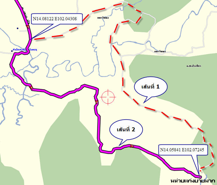 จัดไป พิกัดที่หนึ่ง เป็นสามแยก N14.08122 E102.04308