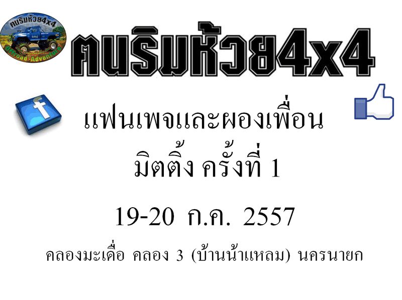 เรียนเชิญพีๆเพื่อนๆ..หมายกำหนดการอย่างเป็นทางการได้รับการยืนยันหนักแน่นจากแนวร่วมแล้วว่าเพจของเราจะจัดงานมิตติ้งพบปะสังสรรค์แบ่งปันความรู้ประสบการณ์ต่างๆเกี่ยวกับการใช้รถออฟโรดใช้อุปกรณ์สำหรับช่วยตัวเองยามฉุกเฉินอาทิ วินซ์ ไฮลิฟท์เป็นต้นการแค้มปิ้งรวมทั้งร่วมแชร์ประสบการณ์จริงๆที่แต่ละคนได้รับมาในวันที่19-20 ก.ค.ที่จะถึงนี้ที่ไร่พี่แหลมคลองมะเดื่อคลอง3ครับ ช่วงเย็นพบปะสรรสังค์กันตามอัทยาสัย มีอาหารเลี้ยง แกงเขียวหวาน ทอดมัน พะโล้ ส่วนช่วงเช้ามีข้าวต้มไก่ครับ มีของรางวัลแจกในงานมากมาย มีเกมต่างๆให้ผู้ร่วมงานได้มีกิจกรรมระหว่างสามชิกใหม่เก่า ช่วงค่ำมีดนตรีโฟคอันไพเราะให้ฟังสบายๆ (ลงทะเบียนหน้างาน รถพร้อมคนขับ 200 บาทผู้ติดตามคนละ100 บาท/ รายได้ทั้งหมดร่วมทำบุญที่หนาวยเขาใหญ่ 17)