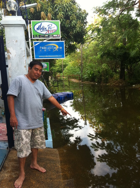 เมื่อวานพี่นอปมาชี้จุดเกิดเหตุรับ ตอนนี้ระดับน้ำขึ้นมาใกล้ถึงลานจาดรถในบ้านเเล้วครับ ประมาณเกือบ40 เซน