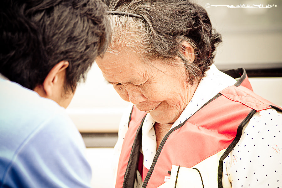 เพื่อนๆกำลังแนะนำวิธีใส่เสื้อชูชีพให้กับคุณยาย