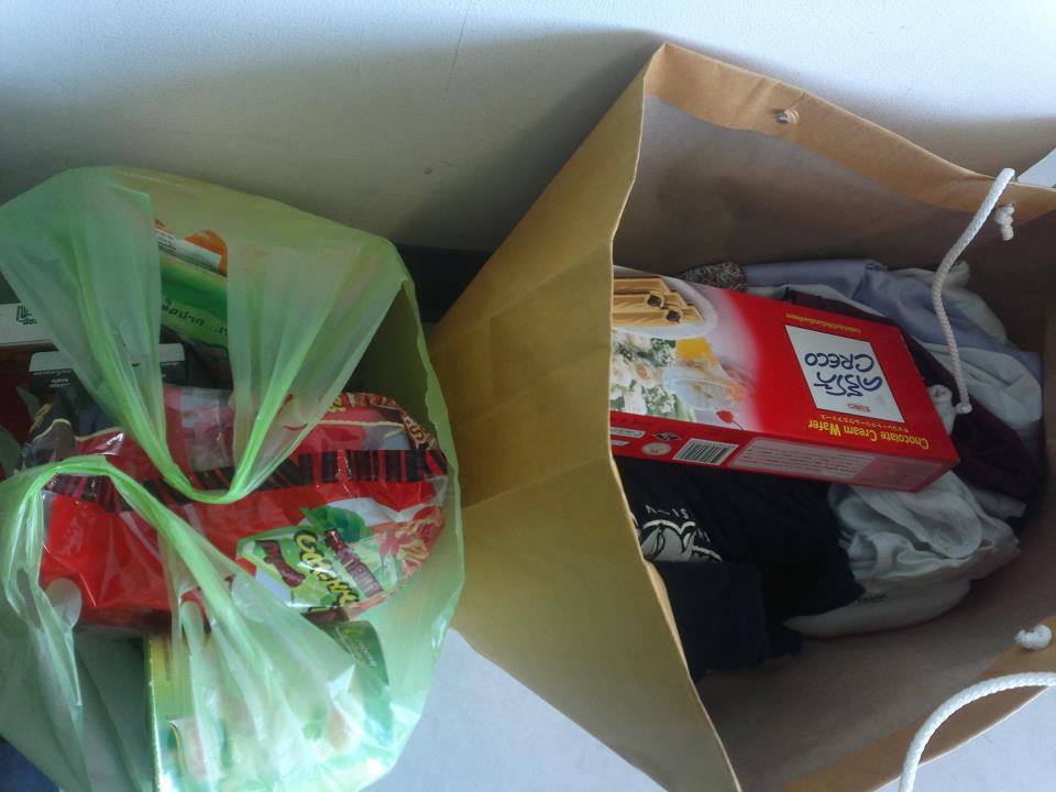 ของผมได้ของบริจาคนิดหน่อยครับ เป็นขนม เสื้อผ้า เครื่องเขียนและ เงินอีกนิดหน่อยครับ