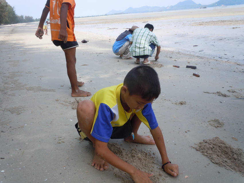 ในรูป ไม่รู้ไคร ทำตัวกลมกลืนกับเจ้าถิ่น กำลังนั่งเขี่ยหาหอยเสียบ