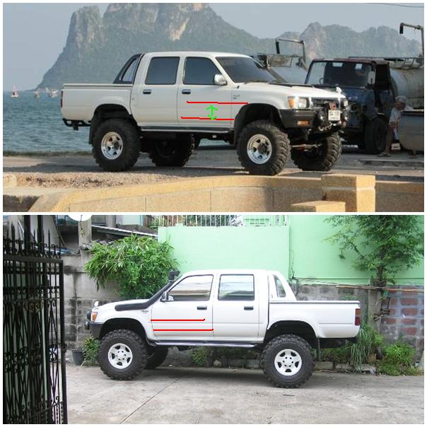 -รถเปลี่ยนบอดี้ครับ ...ช่างบอกว่าเดิมมีรองก้อนยางมา จึงเอาออกทั้งหมด.. แต่ทำไมเหมือนหน้าต่ำกว่าหลังมากขึ้นด้วย ตรงจุดนี้ไม่ได้กลับไปถามช่าง(อู่สี)...รถผมยังไม่ลงตัวเรื่องยาง ฝืนใช้ไปให้เป็นบทเรียน อยากเห็นรถสวยมากกว่าใช้งานดี จึงมีเงื่อนไข,ติดโน่น/นี่(ล้อติดตัวถัง/เสียงดัง/กินน้ำมันมาก) เป็นภาระครับ ...