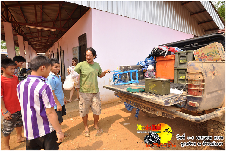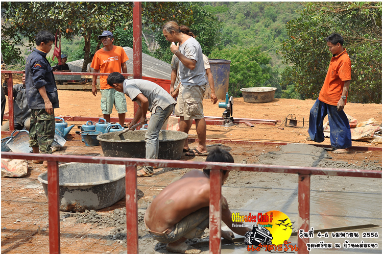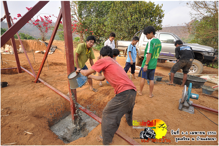 เนื่องด้วยมีการผิดพลาดในการประสานงาน เรื่องร้านขายวัสดุก่อสร้าง ทางพี่ที่ดูแลเรื่องซื้อวัสดุได้สั่งซื้อปูน,หินและทรายที่ร้าน ใน อ.ท่าสองยาง และได้โอนเงินไปให้ร้านเขาเรียบร้อยแล้วครับ ต้องขออภัยทางร้านพี่ต่อด้วยครับ แต่กำหนดการขนวัสดุขึ้นไปแม่ละนา ยังเหมือนเดิมครับ ตอนนี้ หิน และ ทรายได้ไปรอไว้ที่ปากทางขึ้นบ้านแม่ละนาแล้วครับ ระยะทาง 28 กม. เช้าวันที่ 6 เมษายน 2556 รถสิบล้อบรรทุกของบางส่วนไปจาก กทม. ถึงกองร้อย ตชด. 344 ซึ่งเป็นจุดนัดพบ จะเช็ครถที่ไปร่วมบุญครั้งนี้ที่กองร้อยครับ ถ้าได้จำนวนรถหลายคันก็จะขนวัสดุก่อสร้างขึ้นไปให้หมด แต่ถ้าได้จำนวนรถไม่มาก จะขนวัสดุก่อสร้างขึ้นไปเท่าที่จำเป็นก่อน เช่น ปูน หิน ทราย และเหล็กเส้น เพื่อขึ้นไปทำการเทฐานราก เท ตอม่อ ไว้รอทีมใหญ่จะขึ้นไปรอบที่ 2 วันที่ 1-6 พฤษภาคม 2556 ครับ