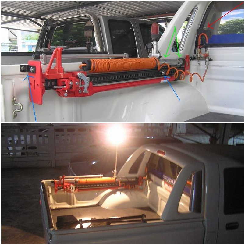 -รูปแนบคต.นี้...บน...ติดตั้งพลั่ว กรอบสีแดงคือขายึด 2 จุด เป็นพลั่วทหารเปลี่ยนด้ามเพราะของเดิมสั้น(สำหรับพกพาเดิน)และไม่เหมาะกับขายึด(ซึ่งเป็นวัสดุเท่าที่หาได้เอง) ..ศรสีแดงชี้ขายึดพลั่ว และราวอลูมิเนียม ด้านละ 2 จุด เป็นรูน็อตที่มีอยู่เดิมเพื่อยึดหหลังคากระบะ และระยะ L/R ไม่เท่ากัน จึงทำให้คิดเองว่าของที่นำมาติดเพื่อปิดรู ควรต่างกัน L/R เพื่อเลี่ยงการเปรียบเทียบกันเองครับ..ศรสีเขียวชี้ตัวล็อคเสียม หมุนด้วยมือ