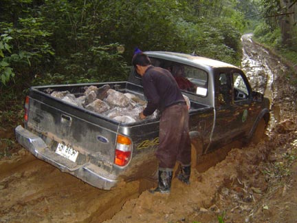 บรรทุกหินเสร็จก็ขับกลับมาเพื่อซ่อมทาง..รถสูงๆเตี้ยลงไปเลย..ช่วงไหนทางขรุขระ เสียงตัวถังบ้าง กระทะล้อบ้างกระแทกพื้นดังสั่น..เล่นเอาใจไม่ดี หากเพลาเสียหาย ข้าวลิงก็คงไม่ได้กิน เพราะตอนโดดขึ้นรถไม่ได้เตรียมตัว..ติดน้ำไปขวดเดียว