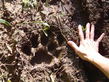 เอาตีนวัดกัน ...เอ้ย..ย..เอามือวัดกับตีนเสือ..มันใหญ่เอาการแฮะ จนท.บอกว่ามันมาป้วนเปี้ยนแถวนี้ 2-3วันแล้ว (เพราะเพิ่งมีคนถ่ายรูปได้เมื่อวานซืน) กะว่าคงประมาณ 5 ศอกเศษ ซึ่ง จนท. บอกว่ากำลังวัยสะรุ่น..