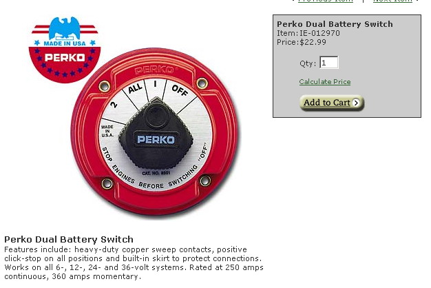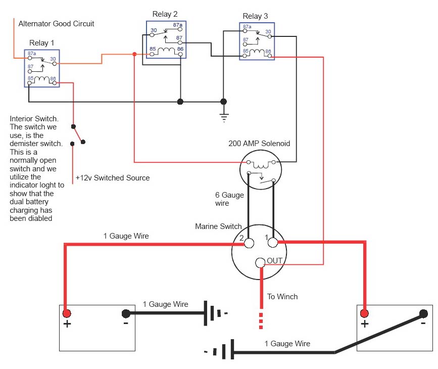 Dual battery system using a 200 amp continuos solenoid and a 1/2/Both 300 amp marine switch. The system is triggered from the alternator good circuit. The default behavior (which is to connect the batteries when the alternator starts to charge) of the systemcan be disabled fromthe interior of