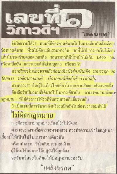 บางทีน่ะครับ(จากการเดินทาง)เส้นทางบางเส้นและหลายเส้นก้อน่าเห็นใจน่ะครับที่เลนซ้ายนั่นเสียหายจนรถหลายๆคันไม่อยากที่จะไปวิ่งเลนซ้ายเลย(กรณีท่านที่ขับช้าไม่เกิน100)เลยวิ่งขวาตลอดทำให้มองดูว่าวิ่งเลนขวาแต่ดันวิ่งช้า(อาจจะเป็นวิสัยของการขับแต่ล่ะคน)ผมตามมาเจอก้อไม่เคยแม้แต่จะตำหนิเขาผู้นั้นเพราะเข้าใจว่าเลนซ้ายวิ่งไม่ได้ดีแน่เพราะกระเด้งกระดอนขนาดแค่เอาไว้แซงยังไม่อยากจะแซงซ้ายเลยเพราะทางแย่มาก.....และก้อมีหลายครั้งที่กลับจากท่องเที่ยวแล้วรถเกิดอาการไม่ดีในการขับขี่วิ่งเลนซ้ายก้อไม่ไหวก้นไม่ติดเบาะเลย.....เลยต้องอาศัยเลนขวาตลอดเวลาเพื่อนร่วมทางตามมาผมก้อให้สัญญาณแซงซ้ายไปเลย....และก้อขอโทษเขาในใจที่ต้องให้ท่านแซงซ้าย....ถ้าเขาเข้าใจเรื่องสภาพถนนก้อดีไป...ถ้าไม่เข้าใจก้อเสียใจด้วยเพราะไม่ได้ตั้งใจจะขับช้าแต่แช่ขวาน่ะครับ......