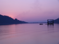 พระอาทิตย์กำลังลับขอบฟ้า เสียดายเรือแล่นช้าไปพระอาทิตย์ตกเร็วไปนิด ที่เห็นเป็นฐานคอนกรีตนั้นเป็นหอดูดาว ทางการปล่อยชำรุดทรุดโทรมมาก เดินขึ้นไปกลัวหล่นลงมา เขื่อนนี้กว่าจะสร้างสำเร็จเกือบ40ปี ทั้งญี่ปุ่น รัสเซียและไทยช่วยกัน แต่ไทยได้ไม้โดยเอาเสาปูนไปแลก เขื่อนนี้เมื่อปีก่อนสมเด็จพระเทพฯ ทรงเสด็จปล่อยปลาบึกหลายแสนตัว เป็นของพระราชทานให้ชาวลาว