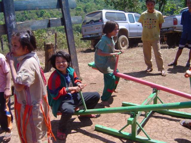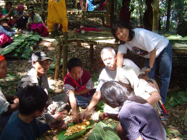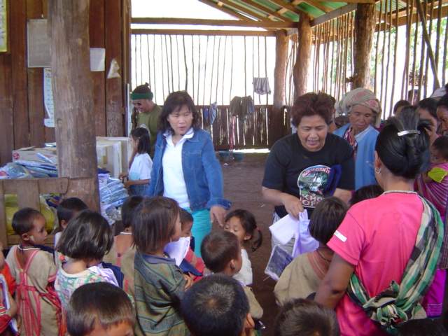 ระหว่างทางพบชาวบ้านกำลังทำที่พักกลางทาง พี่หญิงแจกขนม