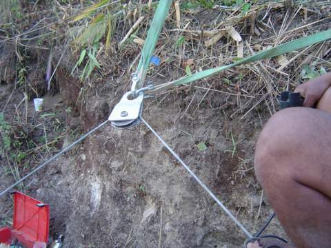 ใช้ต้นไม้ต้นเล็กๆ รวมกันหลายๆต้น ดึงรถขึ้นมา