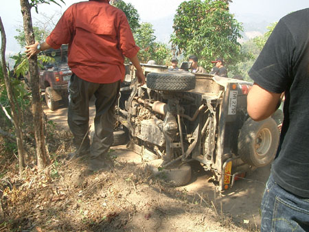 ถูกต้องผมก็ไปทริป แม่ตื่น-ท่าสองยางเหมือนกันและได้สวนกับขบวนที่รถตกเขาเหมือนกันก็แสดงความเสียใจด้วยและยินดีที่ไม่มีใครเจ็บก็คงเป็นผลบุญกุศลช่วย ส่วนทริป BOOMERRANG ก็มีอุบัติเหตุเหมือนกันต่อหน้าต่อตาผมและเพื่อนๆ รถที่เกิดอุบัติเหตุเป็นรถ Jeep หน้ากบ เปลี่ยนเครื่องใหม่เบนซิน เกียร์ออโต้ ยางถนนดำดอกสึกหรอพอควรส่งขึ้นเนินมาคันเร่งค้างเบรคหาย(เข้าใจว่าเกียร์ออโต้คงใช้เบรคมากน้ำมันเบรคเดือดเกิดฟองอากาศ)พอขึ้นเนินได้เจอรถติดจอดอยู่หักหลบปีนแบ็งค์ไปตะแคงหน้ารถเพื่อน แล้วข้างหน้าก็เป็นผมซึงเคลื่อนตัวออกไปแล้วก็โชคดีมีบาดเจ็บเล็กน้อยส่วนรถก็วิ่งต่อได้แต่ไปได้สักพักเบรคหายอีกเลยต้องลากข้างหน้าหนึ่งข้างหลังหนึ่งออกมาได้ครับ ส่วนรถฟอร์ดที่ตกลงไปนั้นไม่ใช่ชุดยกหรอกเส้นทางสายนี้ผมบอกเลยว่าอย่าเผลอหรือประมาทเป็นอันขาดพลาดลงเหวอย่างเดียวไม่เหมือนเมืองกาญ พลาดแค่ตะแคงเจอต้นไม้ เส้นทางแคบหักศอกขึ้นประมาณ 9-10 พับ ถ้าหน้าฝนผมว่าทั้งคนและรถต้อง 200% เกินพิกัดอุปกรณ์พร้อม ฝนนี้พี่เสือเฒ่าจัดให้หน่อยดิ๊