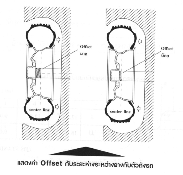 โดยที่ค่า Offset ยิ่งมีค่ามากขึ้น บริเวณแก้มยาง ก็จะเข้าใกล้ตัวถังรถยิ่งขึ้น