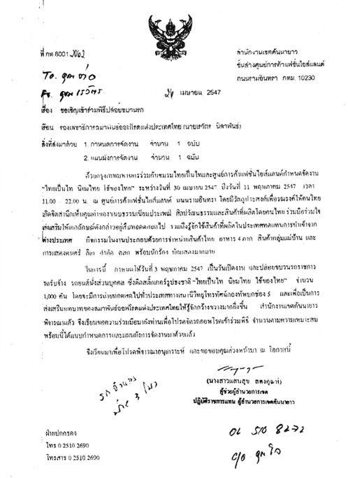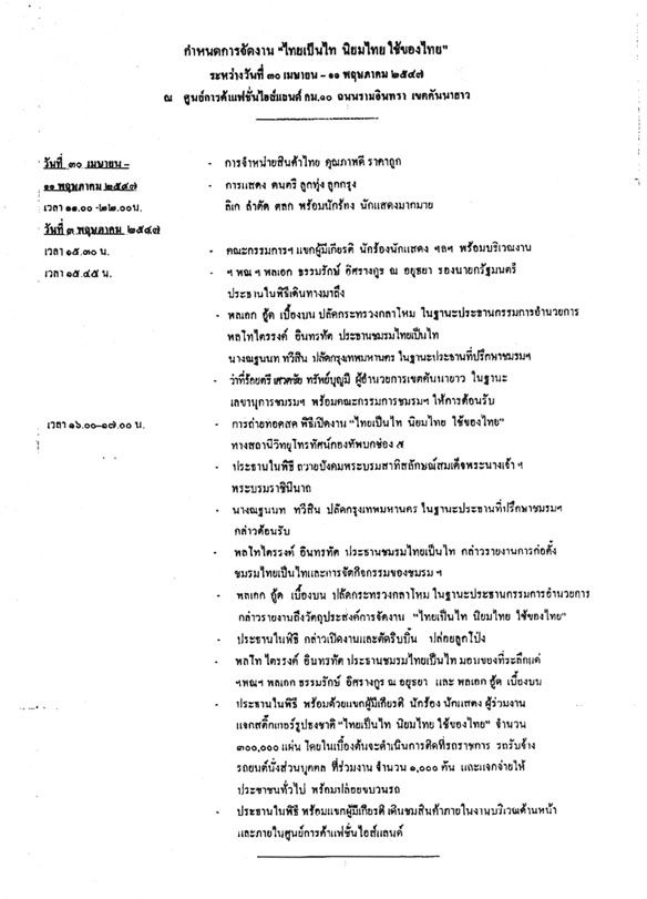 สรุปจากย่อหน้าแรก เป็น การจัดงาน "ไทยเป็นไท นิยมไทย ใช้ของไทย" ระหว่างวันที่ 30 เมษายน - 11 พฤษภาคม 2547 ที่ศูนย์การค้าแฟชั่นไอส์แลนด์