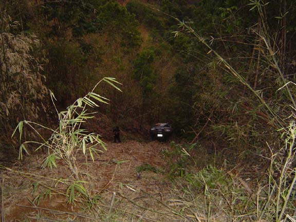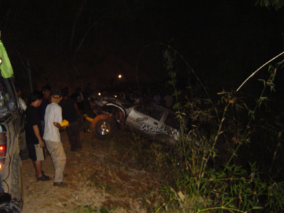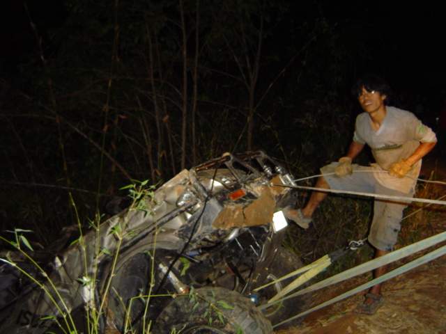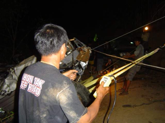 ตอนเกิดอุบัติเหตุ เป็นช่วงเย็นมากแล้ว จึงเริ่มดำเนินการกู้เช้าวันรุ่งขึ้น รถตกลงไปลึกประมาณ 100 เมตร สภาพหงายท้องล้อชี้ฟ้า อยู่ในร่องตัววี และชันมาก ทำให้ยากแก่การกู้