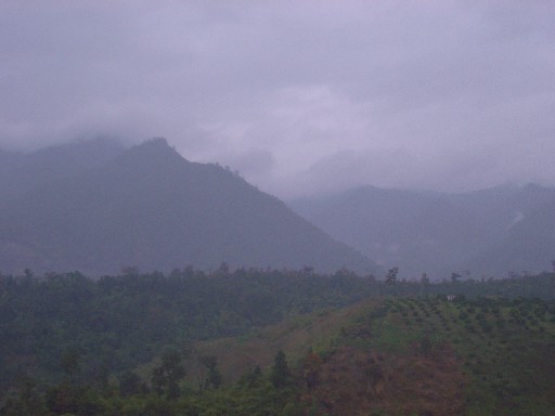 มุมซ้ายสุดของสวนส้ม กับทิวเขา สายหมอกบางๆ หลังฝน