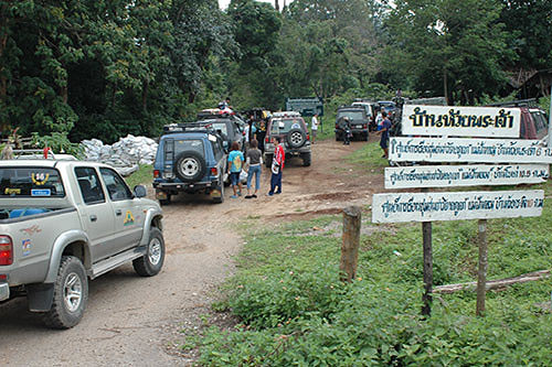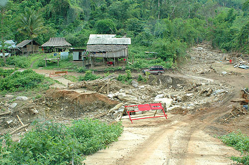 ปากทางเข้าหมู่บ้าน หมดถนนดำแล้วต่อจากนี้เป็นถนนสีแดงสลับกับถนนคอนกรีต (นิดหน่อย)