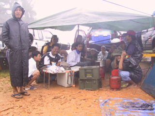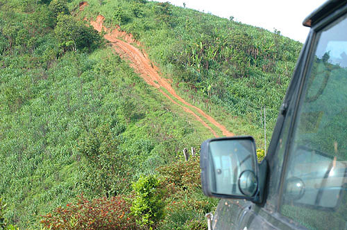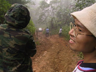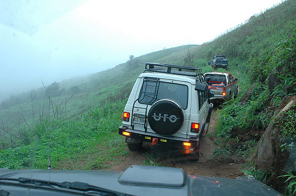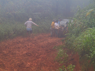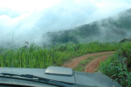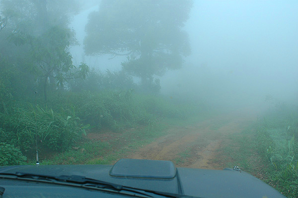 ออกจากบริจากของเสร็จเรียบร้อยแล้วก็มุ่งหน้าสู่ดอยสอยมาลัย เส้นทางนี้ในหน้าแล้งจะมีแต่ฝุ่นหนาแต่ในยามหน้าฝนนี้กลายเป็นดินลื่นๆ ในภาพขณะเดินทางขึ้นดอยบรรยากาศยามบ่ายเต็มไปด้วยหมอกหนา