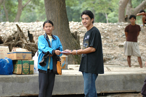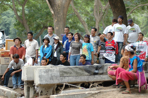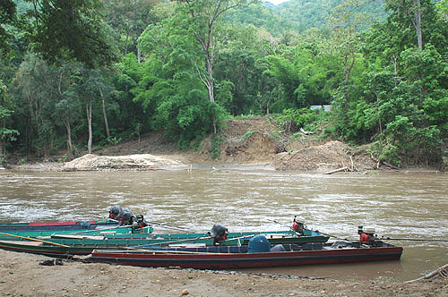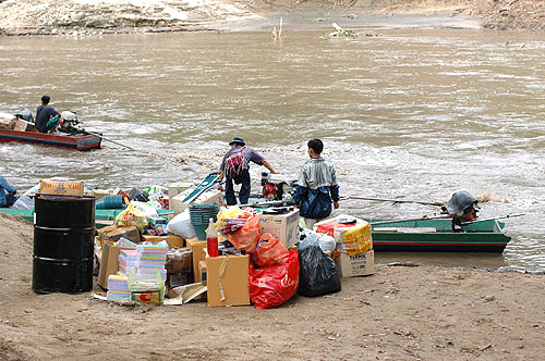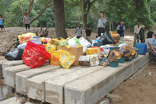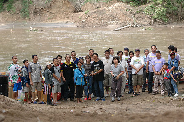 มาจนถึงจุดสุดท้ายที่รถไม่สามารถจะไปต่อได้ เดิมเป็นเพียงลำธารเล็กๆที่รถข้ามได้สบายแต่วันนี้กลับเป็นแม่น้ำที่ไหลเชี่ยว จึงต้องเอาสิ่งของต่างๆที่รวบรวมกันมาเอาลงเรือเพื่อนำไปส่งฝั่งตรงข้ามที่ต้องข้ามอีกสองห้วย เป็นจุดหมายที่พวกเราจะบริจากของ