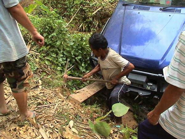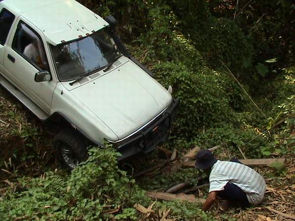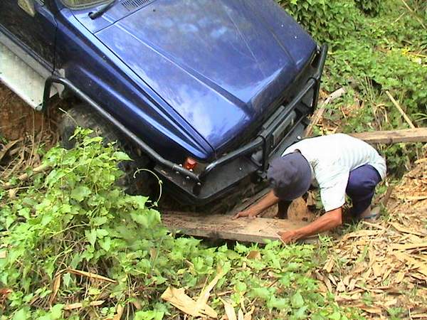 2. ผมไม่เห็นมีเสาไม้หรือล้อยางอะไหล่วางลงในร่อง เพื่อเพิ่มมุมปะทะขอล้อหน้าก่อนที่กันชนจะจิกลงกับพื้นดิน