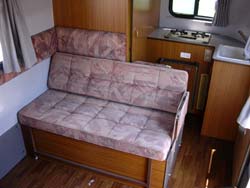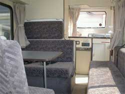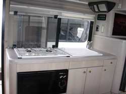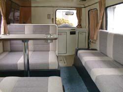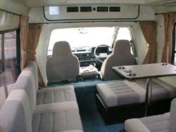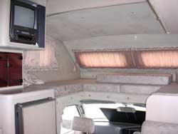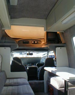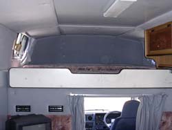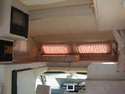 เพดานติดม่าน ด้านบนเพดานสามารถทำที่นอนได้ เพดานมุมซ้ายก็ติด TV จอแบน ด้านใต้ TV จอแบน ก็เป็นตู้เย็น สังเกตว่าห้องโดยสารหลังเจาะทะลุเข้าห้องโดยสารหน้าอีกด้วย