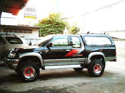 รถผมครับ ใส่ยาง 31" BF AT ขอบ 15" ใส่ปีกนก+ชุดดรอฟเพลา ของเฮียตือ Auto 4 WD ตอนนี้ราคาไม่รู้เท่าใหร่ครับน่าจะประมาณหมื่นกว่าบาท ไม่รวมโช๊คนะ ผมชอบแต่งแบบเรียบๆสปอร์ตๆครับ ไม่ได้เอาไปลุยป่าครับ ขับในเมือง ตอนนี้ก็เพิ่งเปลี่ยนโช๊คจาก Rancho 9000 เป็น OME ครับ ชอบครับหนึบดี ส่วนอื่นๆก็มีเปลี่ยนทอร์ชั่นบาร์เป็น ARB แหนบยกของ OME เปลี่ยนไฟหน้าเป็น XENON สปอร์ตไลท์ของ PIAA ยึดติดกับกันชนเสริมของ TJM ใส่บรรไดข้างเป็นของ Warn รุ่นเกือกม้า ติดวัทบูสท์ของ PIVOT รุ่น TATTOO ติด Timer ของ Aipex รุ่นปากกาวัดโวลท์ได้ด้วยครับ จริงๆแล้วอยากโตกว่านี้นะครับแต่ว่างบประมาณยังมาไม่ถึงครับ 555 ไว้โตกว่านี้แล้วจะไปลุยกับพวกพี่ๆเพื่อนๆครับ