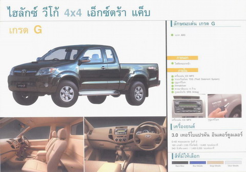 เอาเป็นว่า เชื่อแล้วว่าแน่จริง แต่อยากทราบข้อมูลอย่างละเอียดของ 4x2 ดับเบิ้ลแค็บ 2.5 เกรด E intercooler ว่ามีอย่างไรบ้าง เพราะสายตาไม่ค่อยดี อ่านรายละเอียดที่สแกนในเน็ท แล้วตาพร่า (ตามประสาคนแก่ก่อนวัยใจยังเด็ก) ขอข้อมูลภายนอกและภายใน รวมถึงคุณสมบัติต่าง ๆ เช่น เครื่องเสียง รีโมท การประหยัดน้ำมัน กม/ลิตร เพราะเท่าที่ดูจะพูดถึงเฉพาะ 3.0 เท่านั้น สำหรับราคาขายนั้นไม่ติดใจ เพราะหลงรัก VIGO แล้วนี่ ขอบคุณล่วงหน้าครับ
