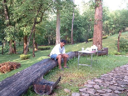 พี่เขาสามยอดตื่นนอนแต่เช้าครับ นั่งอยู่หน้าห้องประชุม ที่กลายเป็นที่พักของพวกเราเมื่อคืน