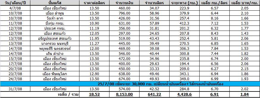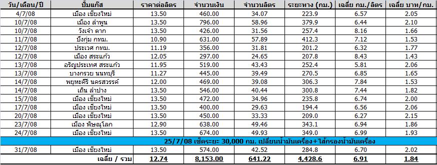 หมดแก๊สไป 2700บาท ขาไปตัวปลิว ขากลับขนผักผลไม้ของฝากมาเต็มคันเลย เหอๆๆ ขาไปวิ่ง 120-130 ขากลับวิ่ง 80-100 ขนของเยอะกัวเบรคไม่ทัน ตกแล้ว ใช้แก๊สไป 8.5กม/ลิตร โดยประมาณคับ