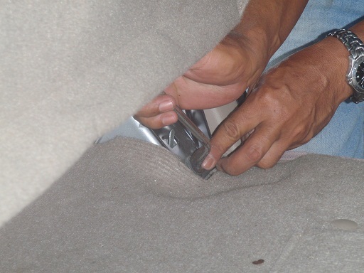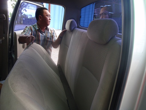 3.ยกเบาะนั่งพร้อมผนักพิงออกโดยยกสูงขึ้น ให้ตัวเกี่ยวที่เกี่ยวแขวนอยู่กับตัวยูที่ผนังตัวรถหลังเบาะหลุดออก พอถอดเบาะได้แล้วก็พับแล้ววางลงไว้ในรถนั่นแหละคับไม่ต้องยกออกนอกรถให้เหนื่อย