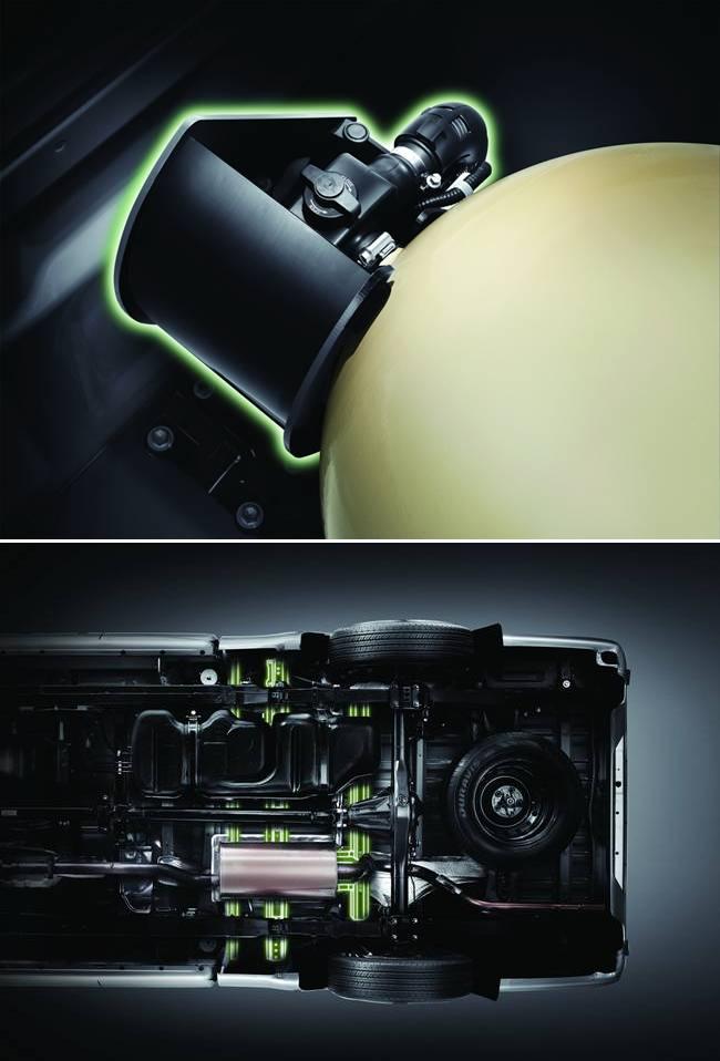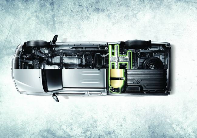 ติดตั้งระบบการใช้ก๊าซซีเอ็นจีผลิตสำเร็จจากโรงงาน โดยออกแบบตำแหน่งช่องรับก๊าซอย่างเหมาะสมตามหลักวิศวกรรมเพื่อความทนทานและปลอดภัย เสริมบ่าวาล์วใหม่ที่เคลือบผิววาล์วไอเสียให้เครื่องยนต์รองรับการใช้งานระบบก๊าซ ท่อร่วมไอดีออกแบบพิเศษผลิตจากวัสดุคุณภาพสูง เสริมโครงสร้างพิเศษใต้กระบะ (Sill Cross Reinforcement) แนวคานเหล็กเพิ่มความหนาขึ้นกว่า 90% เพื่อปกป้องถังบรรจุก๊าซคุณภาพสูง (Super Cylinder Tank) ซึ่งผลิตจากเหล็กกล้ามีความแข็งแกร่งและทนทานจากอุบัติเหตุหรือสิ่งไม่คาดคิด โดยวาล์วหัวถังนิรภัย (Cylinder Safety Valve) มีระบบความปลอดภัย 5 ชั้น และท่อนำก๊าซแรงดันสูงแบบพิเศษ (Super High Pressure Tube) ทนทานกว่าด้วยสแตนเลสเคลือบโพลีเอทิลีนหนา 2 ชั้น