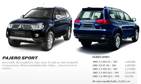 โนบุยูกิ มูราฮาชิ กรรมการผู้จัดการใหญ่ บริษัท มิตซูบิชิ มอเตอร์ส (ประเทศไทย) จำกัด เปิดเผยว่า บริษัทฯ ได้เตรียมขายรถยนต์ มิตซูบิชิ ปาเจโร สปอร์ต เครื่องยนต์เบนซินขนาด 3.0 ลิตร V6 MIVEC อย่างเป็นทางการที่โชว์รูมรถยนต์มิตซูบิชิ ทั่วประเทศ กับราคาขายเพียง 1,295,000 บาท หลังจากนำมาจัดแสดงในงานมอเตอร์โชว์ที่ผ่านมา และได้รับความสนใจจากลูกค้าที่เข้าร่วมชมงาน พร้อมถือโอกาสนี้แนะนำรถยนต์มิตซูบิชิ ไทรทัน เมกะแค็บ พลัส 2.5 วีจี เทอร์โบ 5 AT มาพร้อมสมรรถนะ และการประหยัดน้ำมันยิ่งขึ้น จากอัตราเร่งที่ดีกว่าด้วยระบบเกียร์อัตโนมัติ 5 สปีด พร้อม Sportronic ที่สามารถเลือกปรับเปลี่ยนเกียร์ได้ตามความต้องการ รวมทั้งแนะนำ ไทรทัน เครื่องยนต์เบนซินทั้งในรุ่นเมกะแค็บ พลัส และดับเบิ้ลแค็บ เพื่อเป็นทางเลือกให้กับลูกค้า
