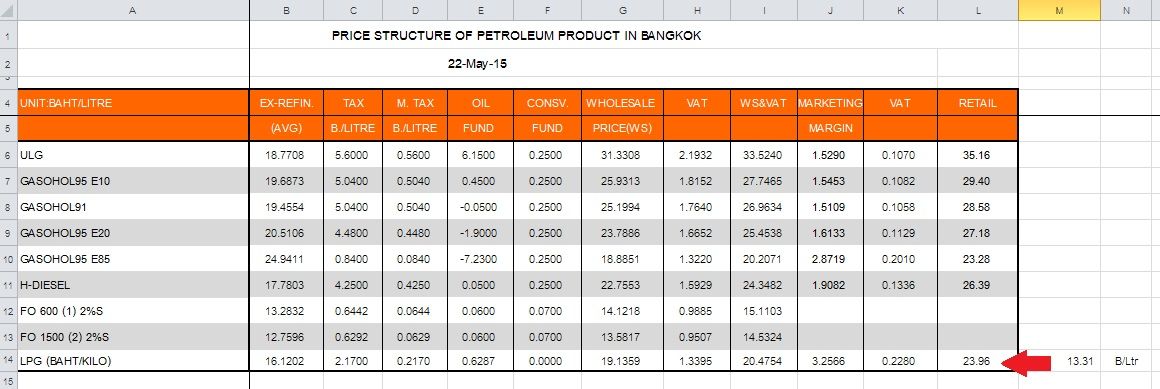 ผู้สื่อข่าวรายงานว่า ปัจจุบันราคาแอลพีจีภาคขนส่ง ราคาจำหน่ายอยู่ที่ 21.38 บาทต่อกิโลกรัม (ก.ก.) ต่ำกว่าภาคครัวเรือน 1.25 บาทต่อก.ก. ทำให้ต้องปรับขึ้นราคาภาคขนส่งให้เท่ากับภาคครัวเรือน โดยมี 2 แนวทางคือปรับขึ้นทันทีรอบเดียวในต้นเดือนต.ค. อีก 1.25 บาทต่อก.ก. หรือแบ่งการปรับขึ้นราคา เป็น 2 ครั้ง ครั้งละ 62 ส.ต.ต่อก.ก. อาจปรับรอบแรกในต้นเดือนต.ค.นี้ และรอบที่สองในต้นเดือนพ.ย.