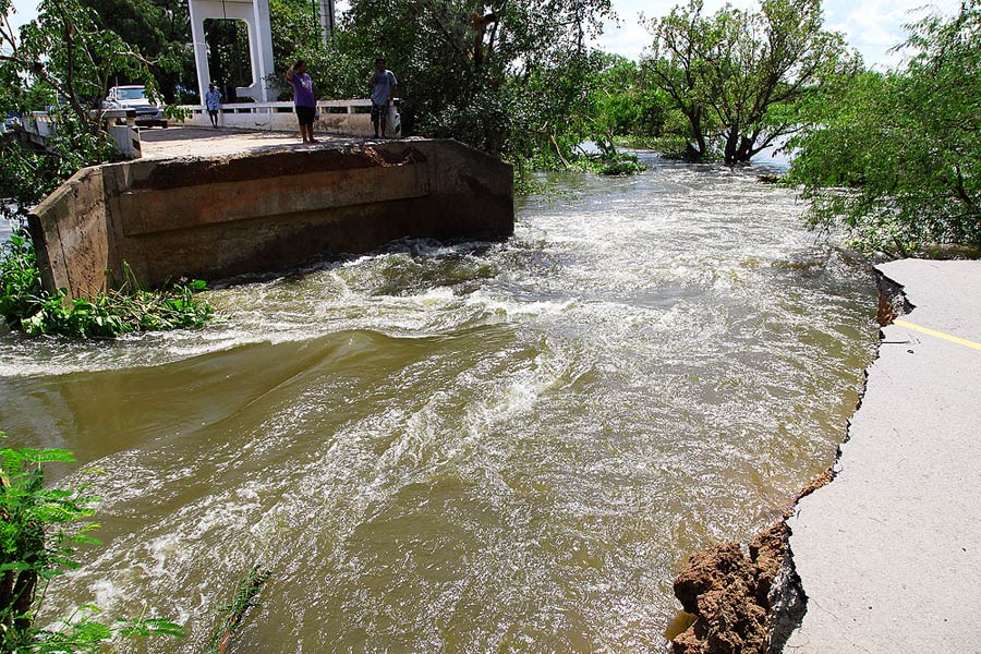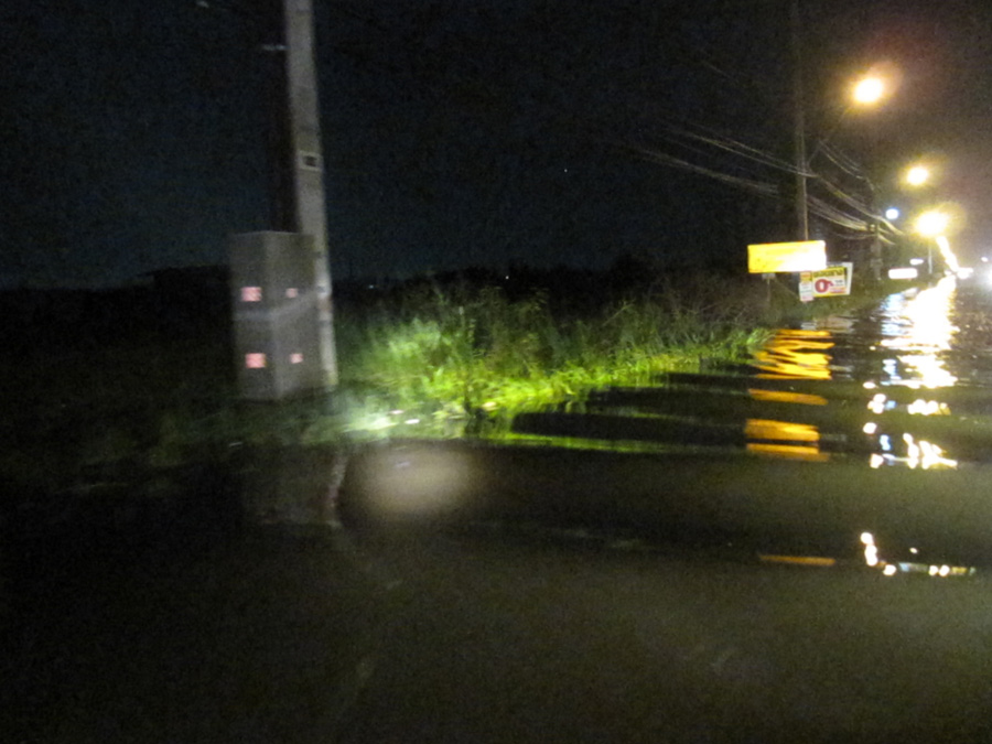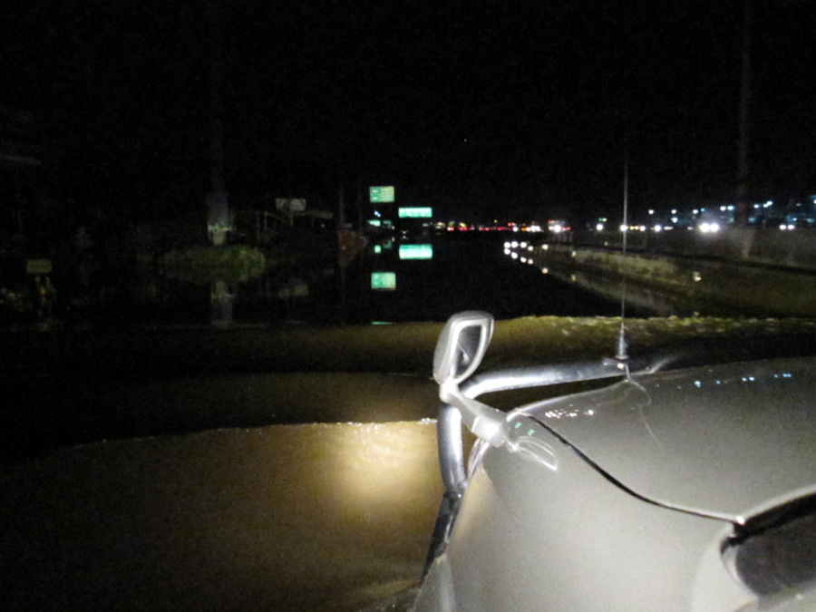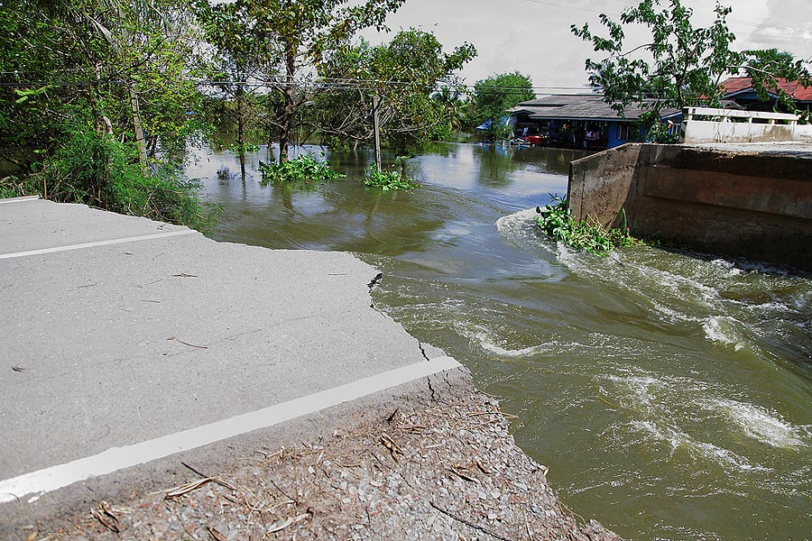 น้ำไหลข้ามถนนแรงพอสมควร เรามองไม่เห็นถนนแล้ว น้ำลึกระดับเอวคนเดิน เรารับคนที่เดินแช่น้ำระหว่างทางเพื่อเข้าไปข้างใน