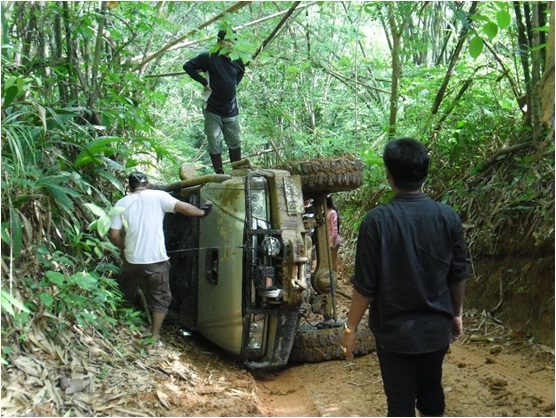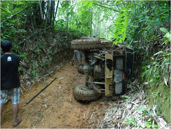 ในที่สุดช่างยุทธให้พลิกตะแคงรถขึ้นมา ด้วยการเกี่ยว Winch ลากอ้อมกับกอไผ่ขนาดใหญ่เพื่อดึงรถไว้ให้ได้ ไม่ให้รถไหลลงเหว