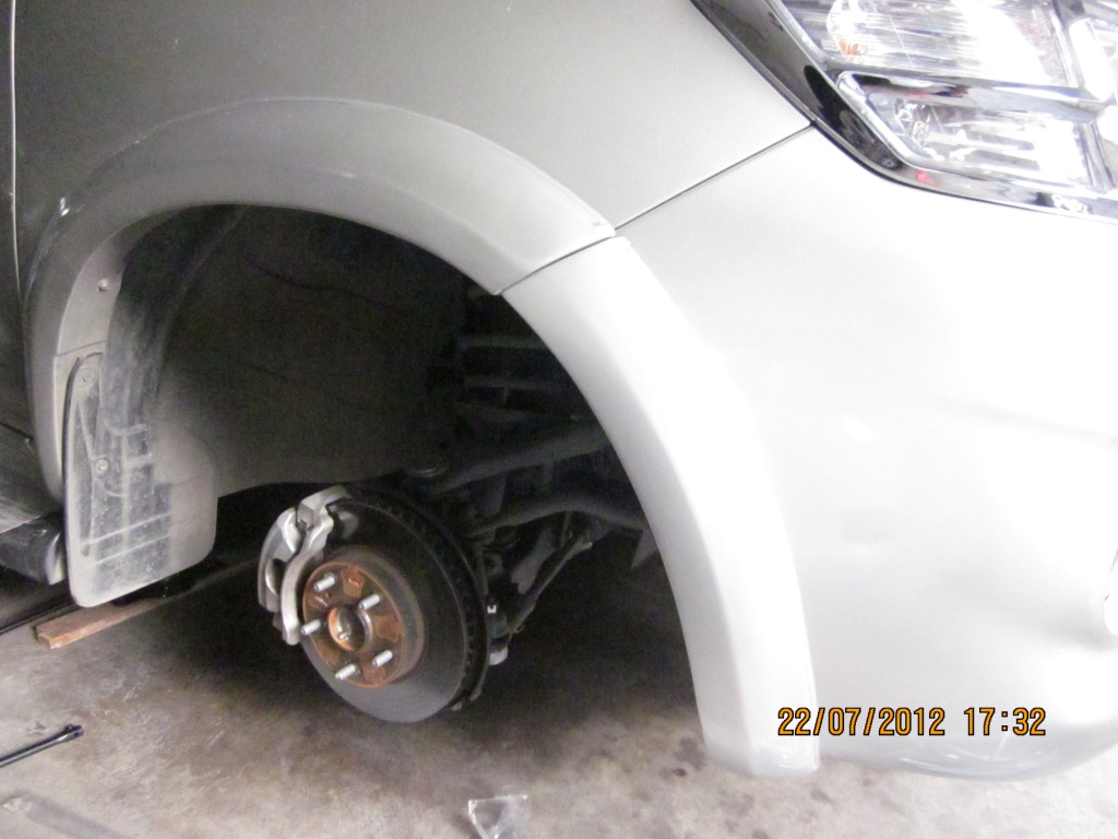 ขั้นตอนที่ 2 เป็นการปลดล๊อคบังโคลนล้อหน้าด้านขวาออก โดยจะมี ตัวล๊อคอยู่ 4 ตัว ใก้ใช้คีมปากยาวบีบแล้วกดลงไป ตัวคลิปล๊อคก็จะหล่นลงไปที่พื้นแต่ละวังจะกระเด็นหายนะครับ แต่ของผมติดบังโคลนเพิ่มเติมแบบเต็มซุ้มล้อ ผมเลยถอดล้อหน้าออกเลยเพื่อเอาซุ้มล้อออกก่อน