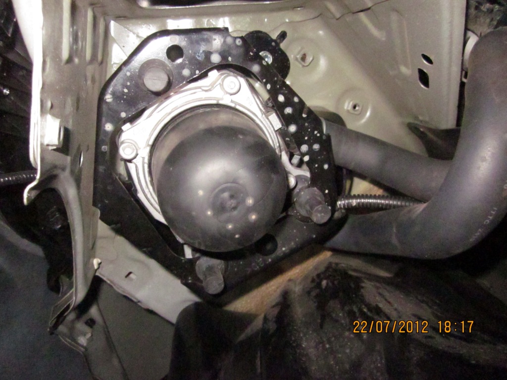 ขั้นตอนที่ 4 ให้มุดไปใต้กันชนหน้าขวา ให้ถอดเจ้าตัวปัญหาออกมาเพื่อเอาฟองน้ำออก มันจะมีน๊อตเบอร์ 10 ยึดอยู่ 3 ตัวให้ทำการถอดโดยใช้ประแจบล๊อคตัว T เบอร์ 10