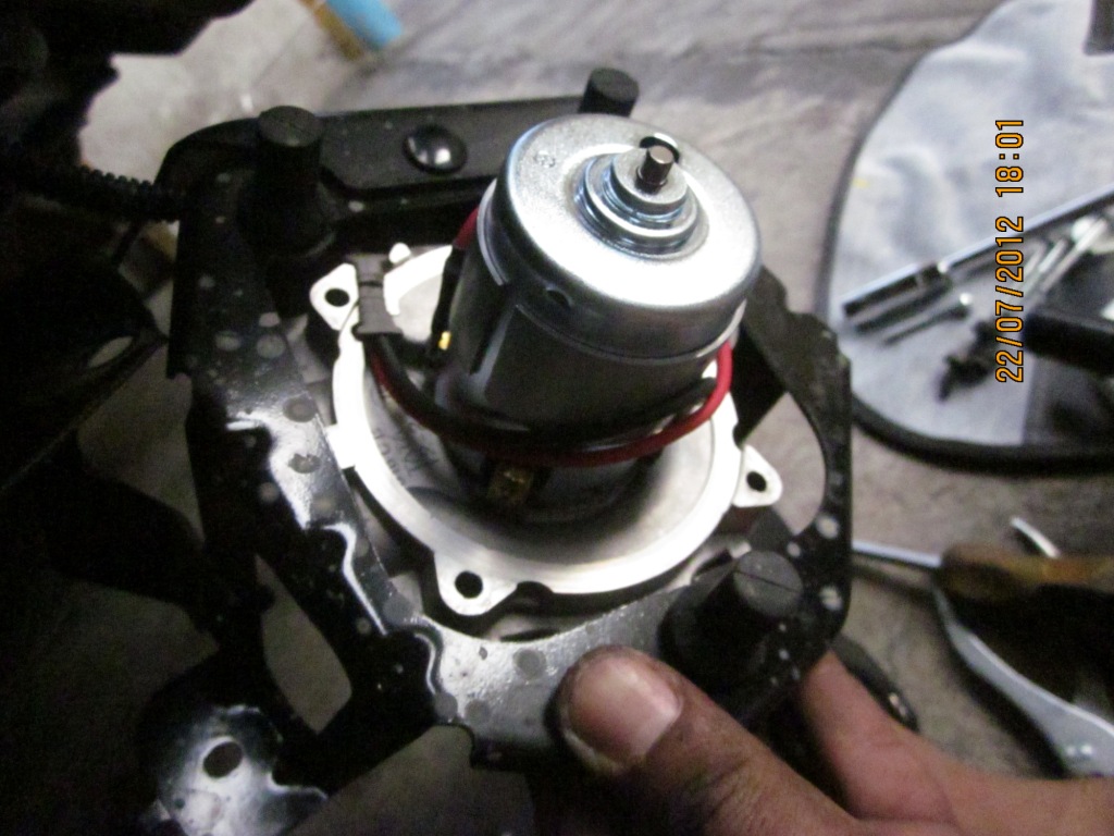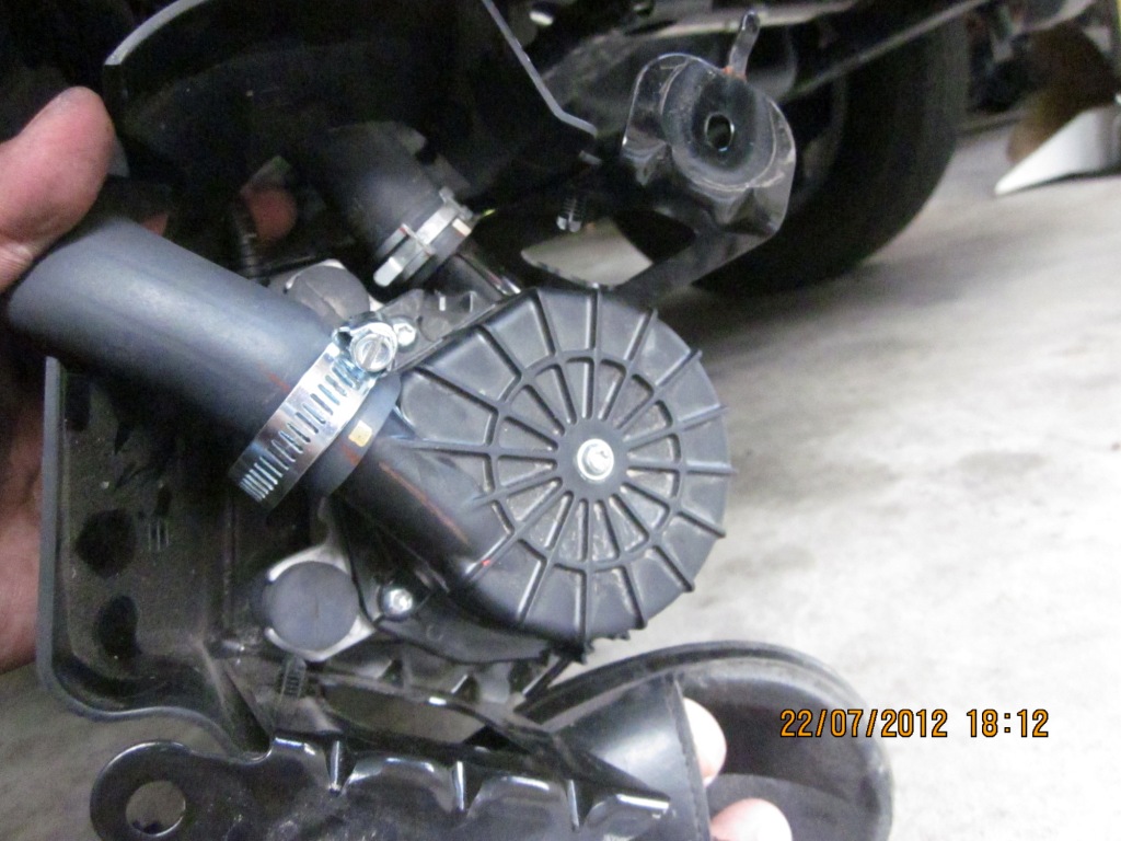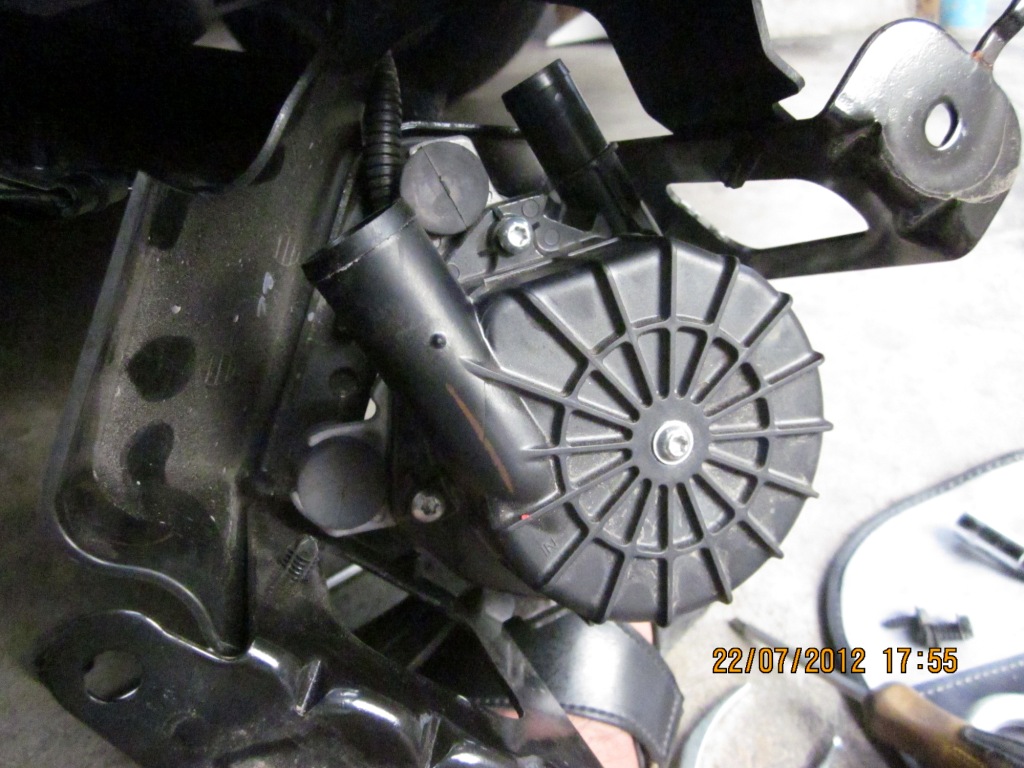 เมื่อคลายน็อตทั้ง 3 ตัวออกมาแล้ว ปั๊มอัดอากาศก็จะหลุดลงมาอย่างที่เห็นแบบนี้ครับ