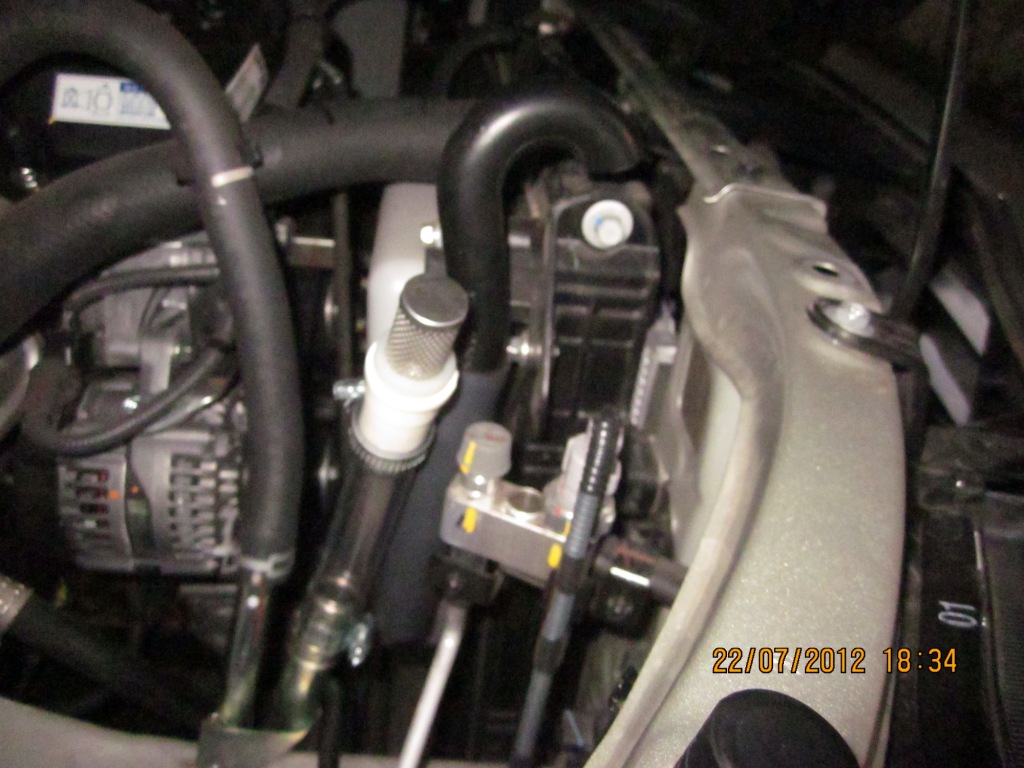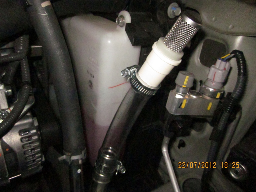 ขั้นตอนต่อไป เป็นการใส่อุปกรณ์ ป้องกันไม่ให้สิ่งแปลกปลอมเข้าไปในระบบ ของผมใช้วิธีแบบในภาพเลยครับ เพราะในครั้งแรกที่ผมทำจะไปยึดกับที่ปลายท้อตรงส่วนโค้งๆ ที่ยึดติดกับหม้อน้ำแต่ว่าพื้นที่ยึดเข็มขัดรัดสายมันน้อยมากทำให้อุปกรณ์ที่ผมทำมันหลุดหายไป ครั้งนี้ผมจึงนำสายยางมาต่อตรงตามภาพเลย รับรองไม่หลุดอย่างแน่นอน 55555