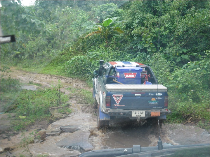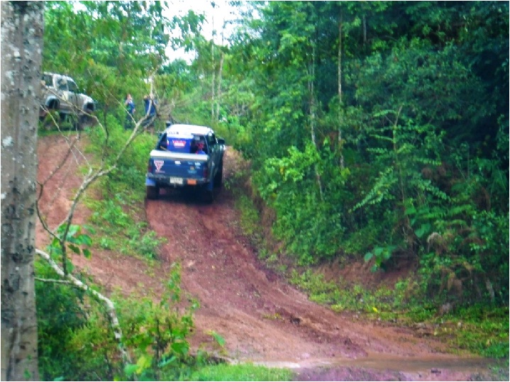 แต่เจ้าถิ่นแจ้งว่าฝนตกลงหนักทุกวัน ทำให้ผาตัดรถออฟโรดขึ้นไม่ได้เสียหายกันไปหลายคัน ให้เปลี่ยนเส้นทางมาที่ผาตั๋วเพ็งแทน