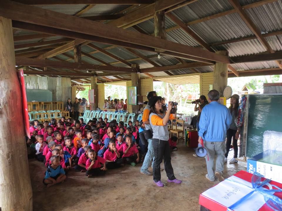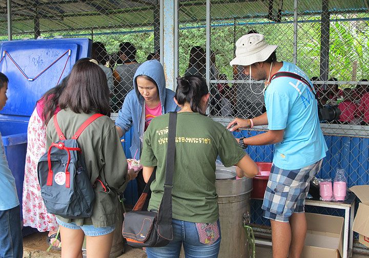 เด็กนักเรียนที่มาร่วมงานรับของบริจาคและรับเลี้ยงอาหารกลางวันจากกลุ่มลายไผ่