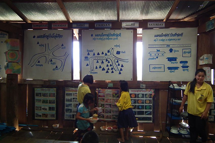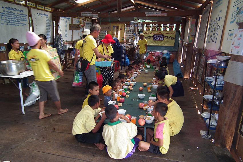 ทานข้าวรวมกันเป็นระเบียบเรียบร้อย ก่อนทานมีบทกล่าวขอบคุณด้วยครับ ในอาคารที่ใช้เป็นทั้งห้องเรียน ห้องอาหาร