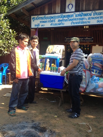 คุณปัญญาผู้จัดการฝ่ายขาย นูบูล มอบน้ำผลไม้ให้กับเด็กๆ ครูและชาวบ้าน