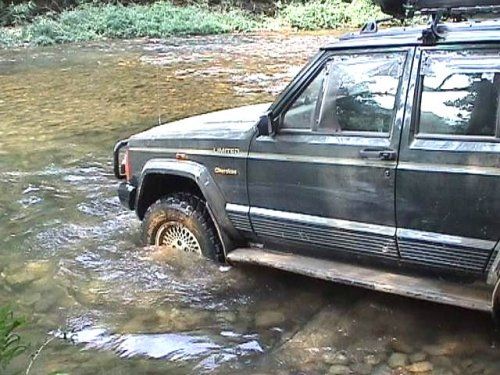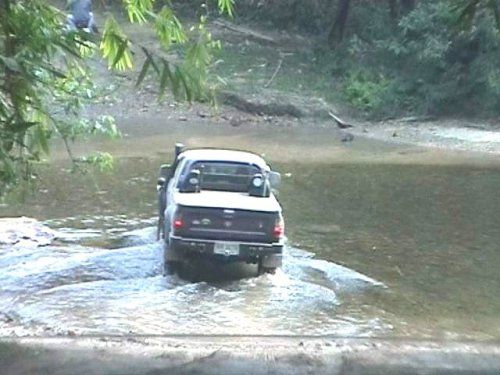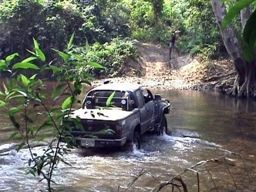 เวลาล่วงเลยไปเที่ยงกว่า ยังไม่ถึงด่านเกาะสะเดิ่ง จึงตัดสินใจแวะตั้งวงกินข้าวกลางวันกันริมลำธาร น้ำใส ไหลเอื่อย ๆ เย็นสบาย เจ้าน้ำตาล ก็ได้ออกมาวิ่งเล่นทานข้าวกลางวันกับเขาด้วย กินอิ่มก็เดินหน้ากันต่อไป มีเส้นขับลุยผ่านตามห้วยน้ำเป็นระยะทางประมาณ 300 เมตร สวยน่าดู เลยตั้งรถเรียงแถวถ่ายรูปมาอวดกัน งานนี้เต้ย (แฟนริชาร์ด) รับหน้าที่เป็นตากล้อง กับ เนว์ฯ ท่าทางทะมัดทะแมง น่าอิจฉาริชาร์ดจริง ๆ พ้นห้วยนี้จะเป็นทางชันขึ้นเขาเป็นส่วนมากมีร่องลึกบ้าง เป็นหินบ้าง