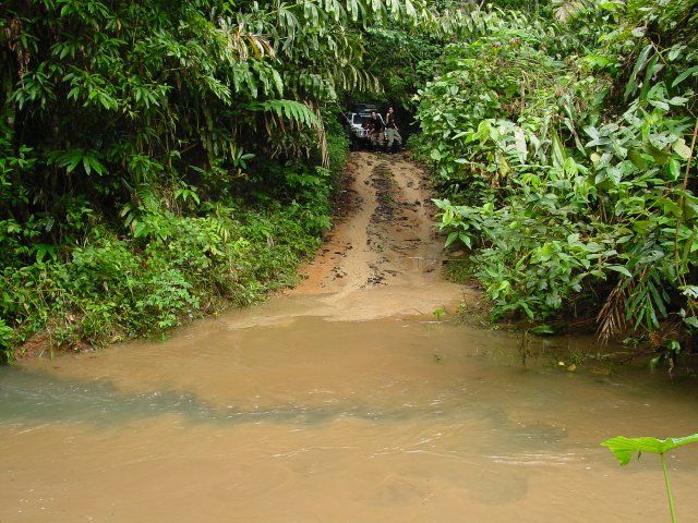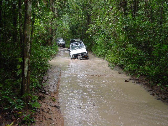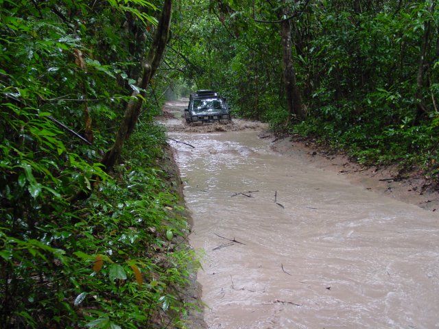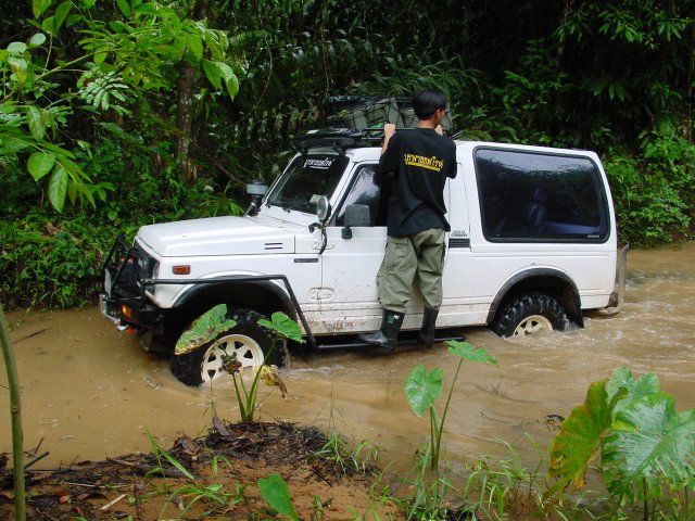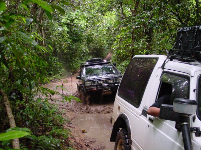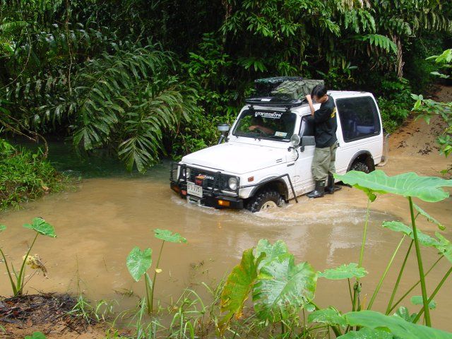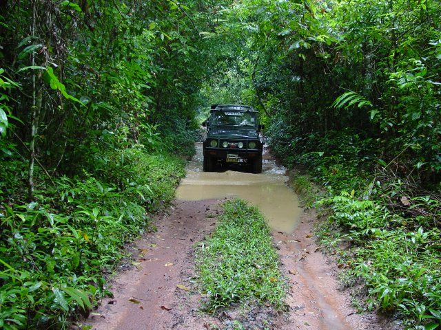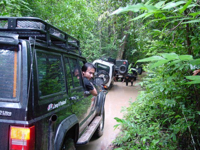 หลังจากเก็บของในที่พัก และร่ำลาเจ้าหน้าที่กันแล้ว ช่วงขากลับออกมา สภาพเส้นทางโหดมากกว่าขาเข้า มีน้ำเยอะกว่า เนื่องจากฝนทึ่ตกพร่ำๆทั้งคืน ทำให้ร่องบางร่องลึกเสียจน ทำให้ผมต้องประเดิมใช้วินช์ตัวใหม่ที่พึ่งติดตั้ง ทำให้ใครบางคน ถึงกับบ่นเสียดายที่ไม่ได้ใช้เหมือนผมทั้ง ๆที่พึ่งติดมาเหมือนกัน เราใช้เวลาไม่นานนัก ออกมาถึงตลาดหนองคอก เพื่อ แวะทาน อาหารเที่ยงกัน ก่อนที่จะเคลื่อนขบวนไปต่อที่หน่วย ลำพระเพลิงที่ แว่ว ๆ มาว่าสภาพเส้นทางโหดไม่เบา ซึ่งกลุ่มเราตกลงว่าจะไปสำรวจกันก่อนกลับ โดยใช้เส้นทางเลยตลาดหนองคอกไปทาง สระแก้วอีกประมาณ 10 กิโลเมตรก็จะเจอด่านทหารพราน เลยด่านประมาณ 200 เมตรจะมีทางแยกซ้ายเล็ก ๆ บริเวณคอสะพาน เข้าไปข้างในที่ค้อนข้าง รกชัฏ หญ้าและกิ่งไม้ที่ปิดเส้นทางแสดงให้เห็นว่า ไม่เคยมีใครใช้เส้นทา งมาเป็นเวลานานแล้ว ไม้เล็ก ๆ ที่ล้มขวางทางมีให้เห็น ตลอด 2 กิโลเมตรแรก แต่สิ่งที่ผมกังวลมากกว่าความลำบาก ของเส้นทางคือ เจ้าของรอยใหม่ ๆ ที่ย่ำไว้เป็นเทือก หนำซ้ำยังเป็น รอยที่ใหม่ ๆ ทั้งนั้นเลย ครับ ผมหมายถึง ช้างป่า !!! นี่เป็นครั้งแรกในการเดินทางของผมที่ขับรถไป กังวลไป ส่วนหมึกแดง ไม่ต้องพูดถึง ร้องกลับเลยทีเดียว ยิ่งเข้าไปลึกเรื่อยๆ ก็ยิ่งเจอรอยมันมากขึ้นไปด้วย ทางก็แคบ ไม่มีที่กลับรถเสียด้วย ถ้าเจอมันจัง ๆ จะทำยังงัย ก็นึกไม่ออกเหมือนกัน สงสัยถ้ามาอีกครั้ง คงต้องเตรียมอ้อยมาเลี้ยงช้างด้วยแน่ ๆ แต่แล้วการเดินทาง ของพวกเราก็ต้องหยุกชะงักและหันหัวกลับออกมา เพราะ จิ้งโจ้ป่า ของเราเกิดไม่พร้อมขึ้นมาอีก (มารู้ทีหลังว่าทำให้หลายคนถึงกับดีใจ) ด้วยยางหุ้มเพลาหน้าที่ขาด และไม่รู้เป็นไร ตอนนี้ขับเคลื่อนได้เพียง สองล้อหลังด้วย พวกเราจึงกลับออกมาด้วยความเสียดาย ....