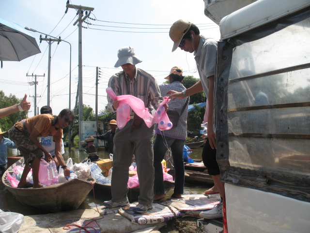 จัดของลงเรือ รอบๆวัดมีแต่น้ำ